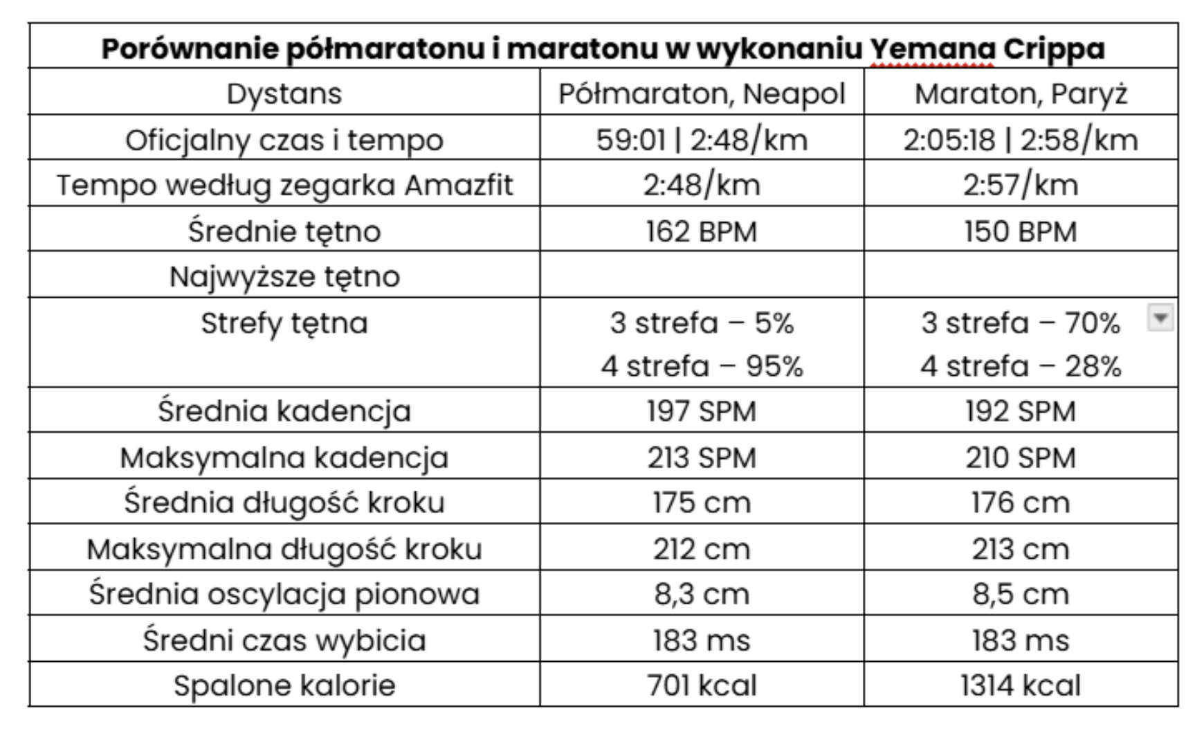 „Ponad 42 kilometry pokonuje się wolniejszym tempem niż półmaraton, ale wraz z upływem czasu utrzymanie tempa w trzeciej, a później w czwartej strefie tętna staje się coraz trudniejsze. Dlatego dane o podobnych wartościach w obu biegach mogą oznaczać zupełnie inne obciążenie organizmu. Warto o tym pamiętać podczas przygotowań i startów na królewskim dystansie”, wyjaśnia Crippa.