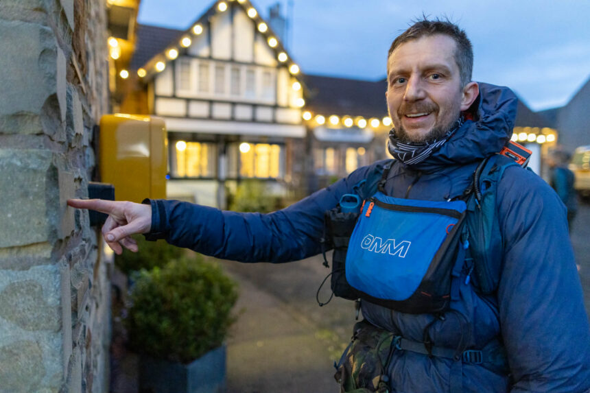 Grzegorz Korsak przy słynnej ścianie Borders Hotel na mecie Montne Spine Race 2026
