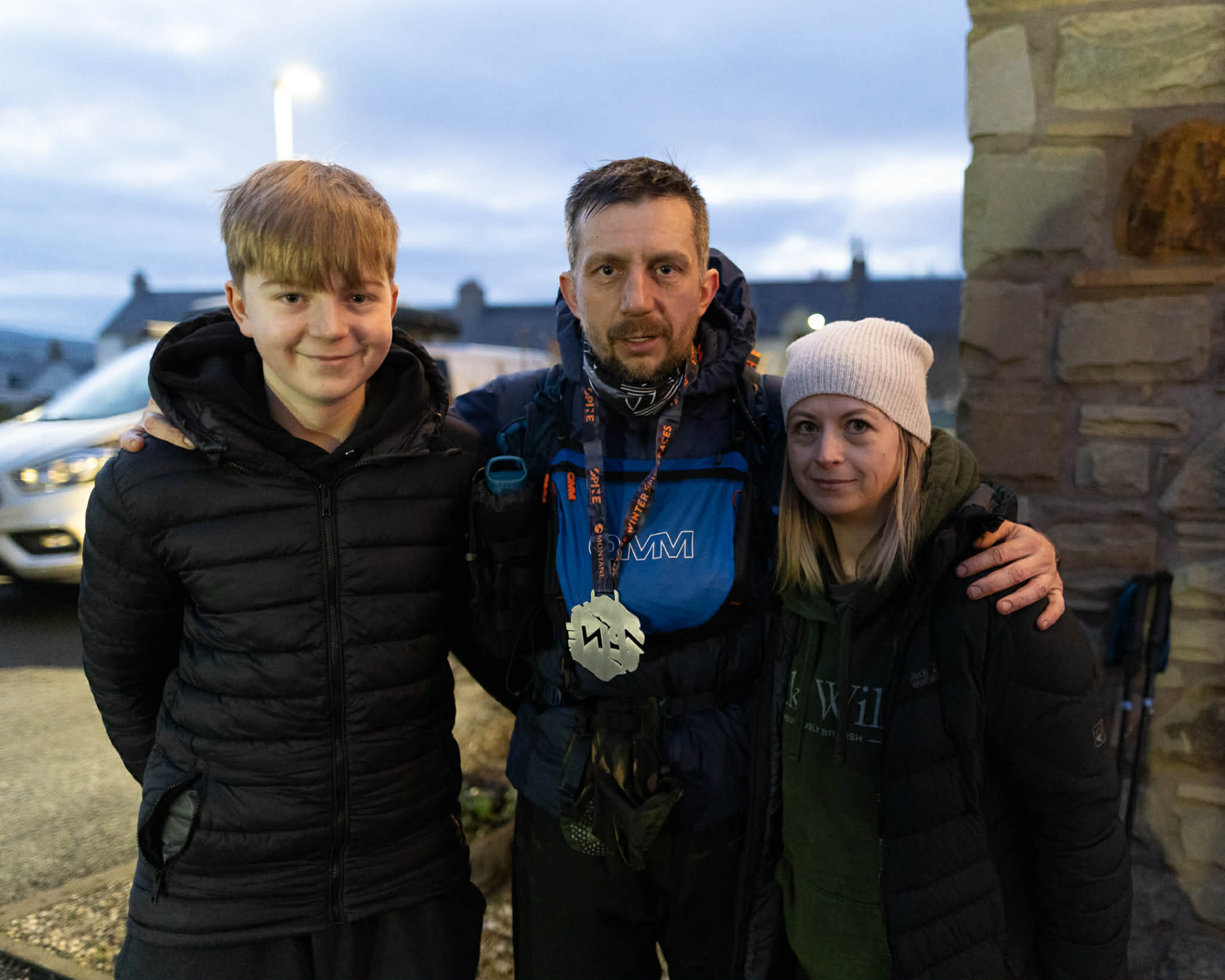 Grzegorz Korsak z żoną Reginą i synem Kubą na mecie Montane Spine Race 2026